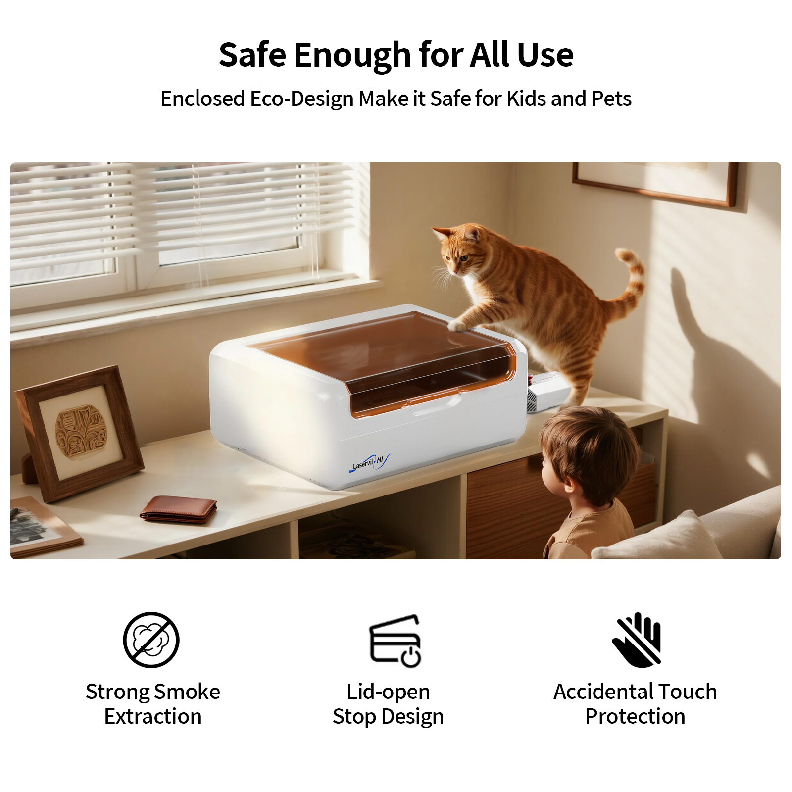 M1s features a protective cover and emergency stop button, ensuring safe indoor operation so you can create with confidence.